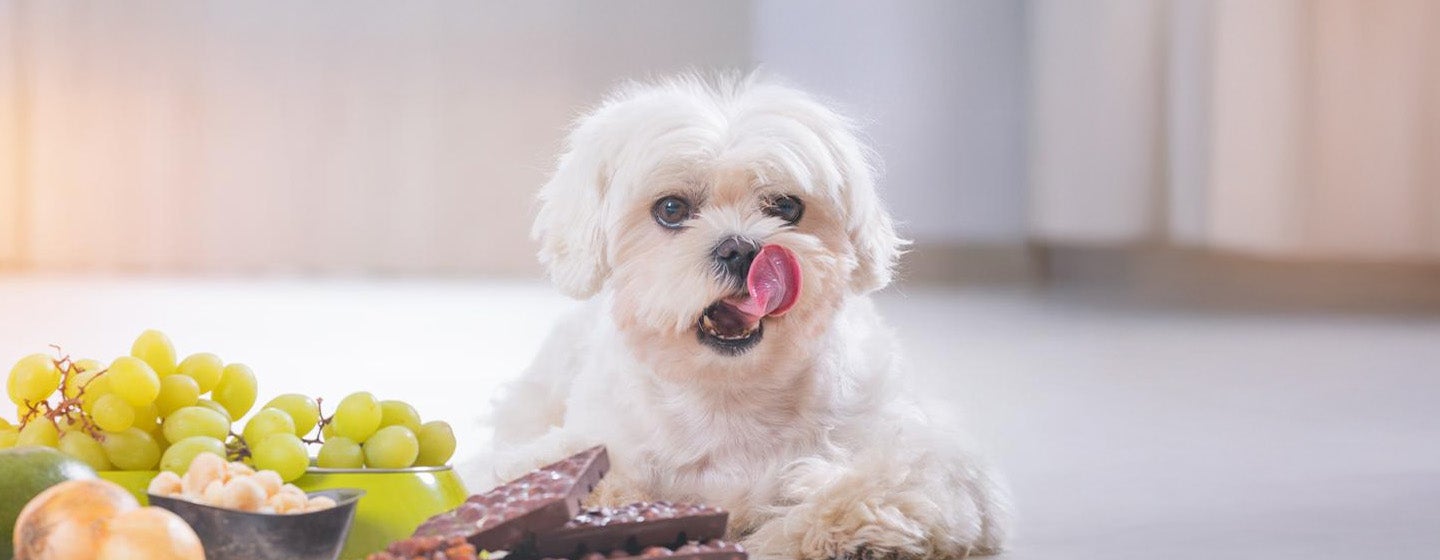 There are many common foods that dogs can’t eat and non-food substances, including plants, which are potentially poisonous. Some of these you’ll know, while others might come as a surprise. Many foods, medicines and plants which are safe for humans, can be toxic to our pets. In fact, some common household items can be life-threatening for dogs. We’ve put together this comprehensive guide so you can learn about poisonous foods for dogs, which plants to avoid and what chemicals to always keep out of reach of your four-legged friend. Some of the items on this list may surprise you! What foods can'tdogs eat? We all love to treat our pups to the occasional treat! While some human foods are fine in moderation, others should be avoided entirely. Harmful foods for dogs include: Certain fruits and vegetables Many fruits and vegetables are fine for dogs to eat in small quantities, butcan pose a choking hazard if they're notcut into small piecesand fed under supervision. However, the following foods should be avoided, and can be very toxic, even in small amounts: • Raisins. • Sultanas. • Grapes. • Onions. • Garlic. • Some kinds of wild mushrooms. Other plants that can cause toxicity in dogs when eaten in largequantitiesinclude: • Rhubarb (mainly leaves). • Potato leaves and stems. • Tomato leaves and stems. • Apple seeds, Cherry pits, Apricot pits, Peach pits, present a small risk only but can cause obstructions in the digestive system.