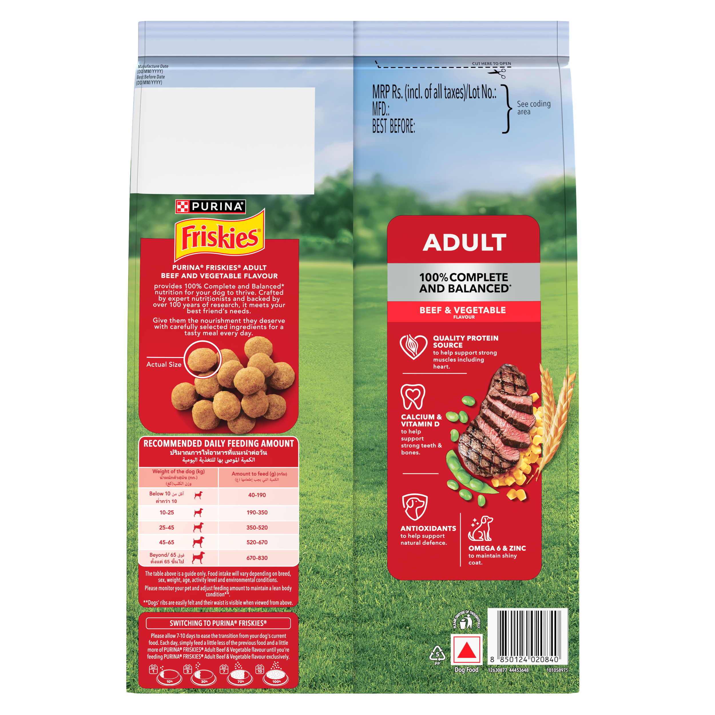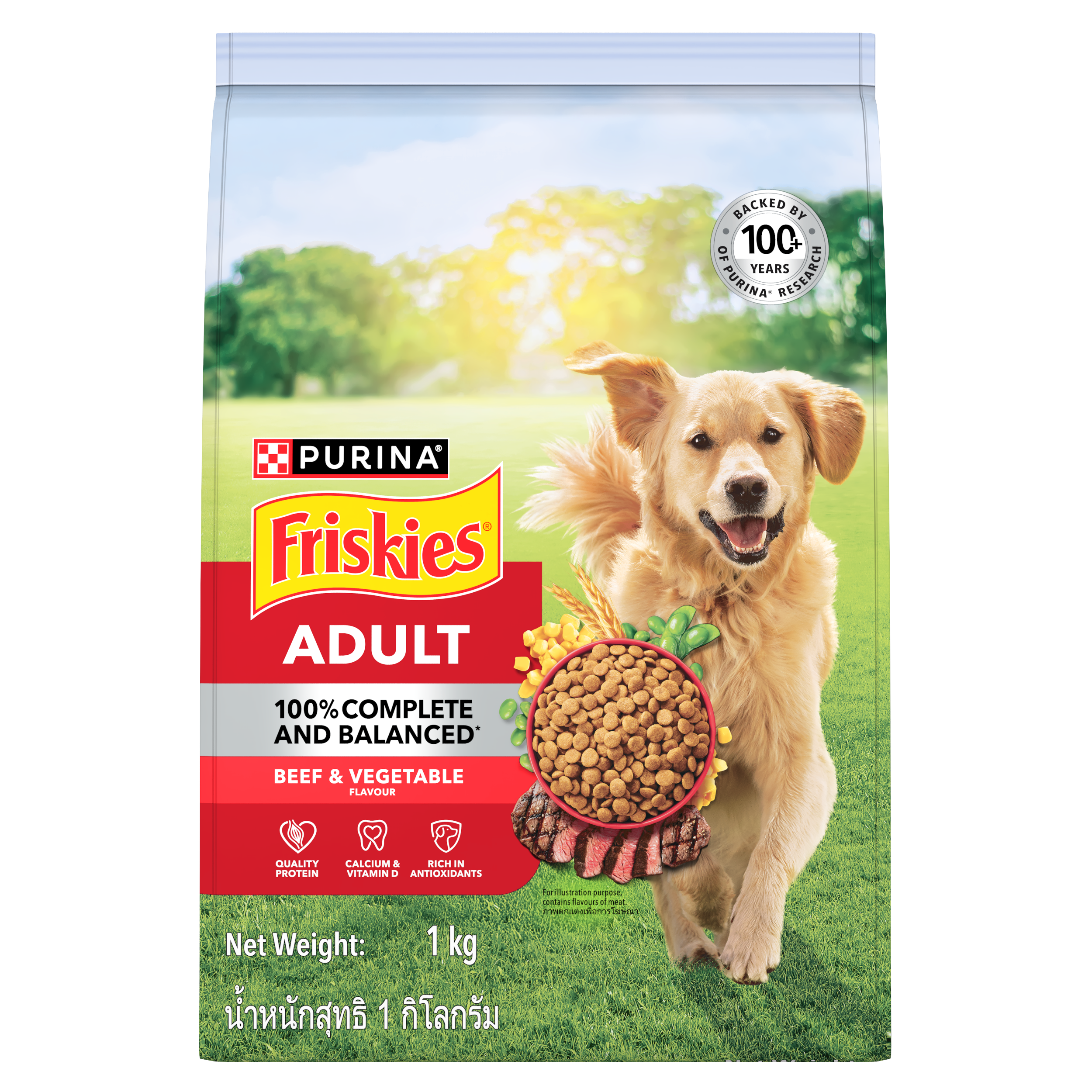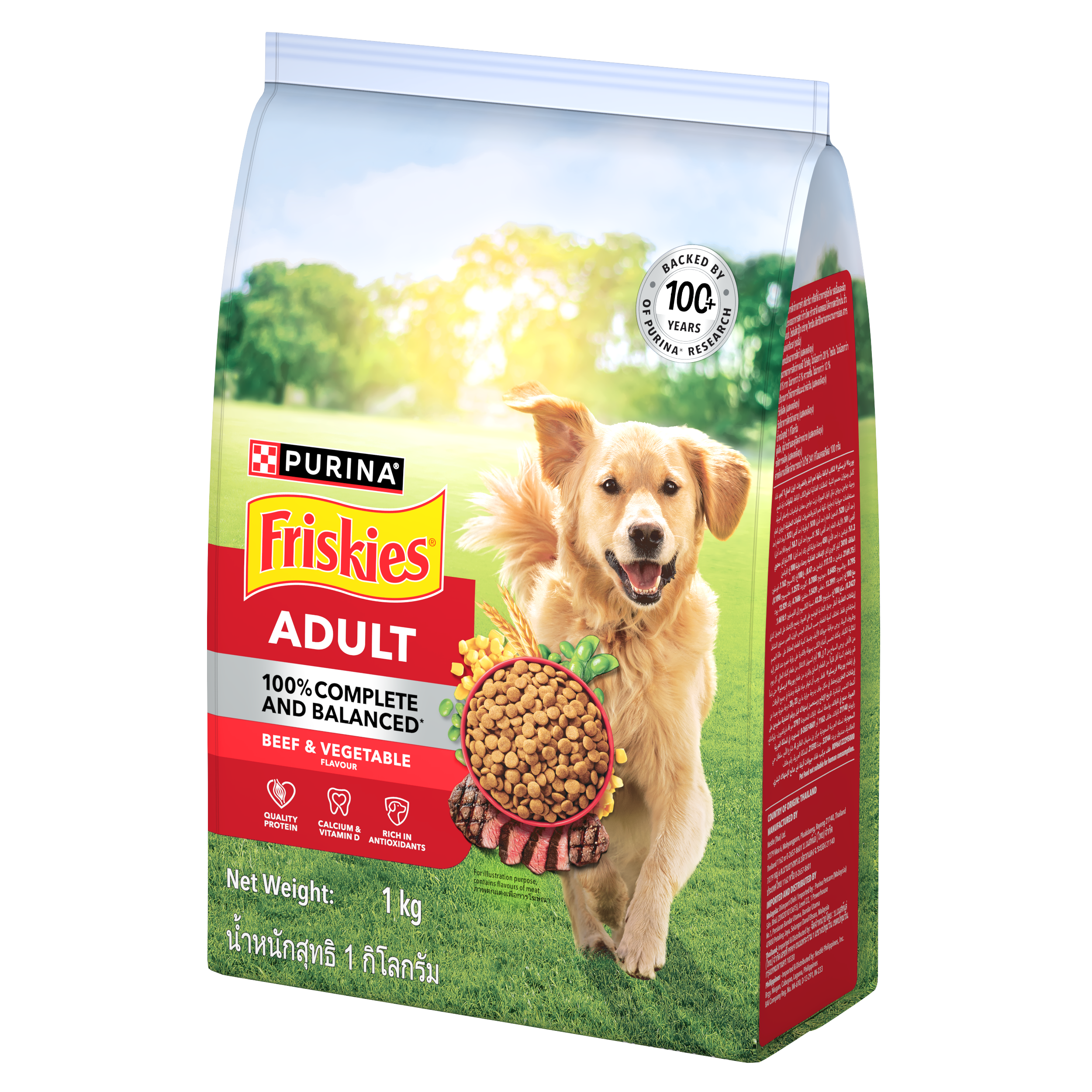Give your dogs 100% Complete & Balanced Nutrition with Friskies Adult Beef and Vegetable Flavor. 100% complete and balanced dry dog food for adult maintenance. Formulated by expert nutritionists and backed by over 100 years of Purina research, it delivers the nutrients adult dogs need to stay active—supporting strong muscles, healthy teeth and bones, skin and coat, and natural defences—so your dog can run, jump, chase, and thrive every day.