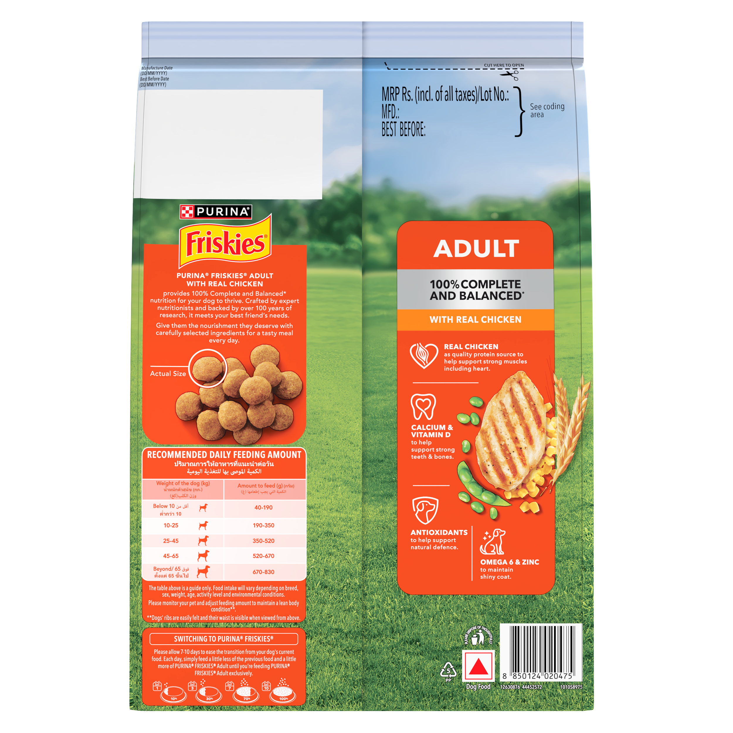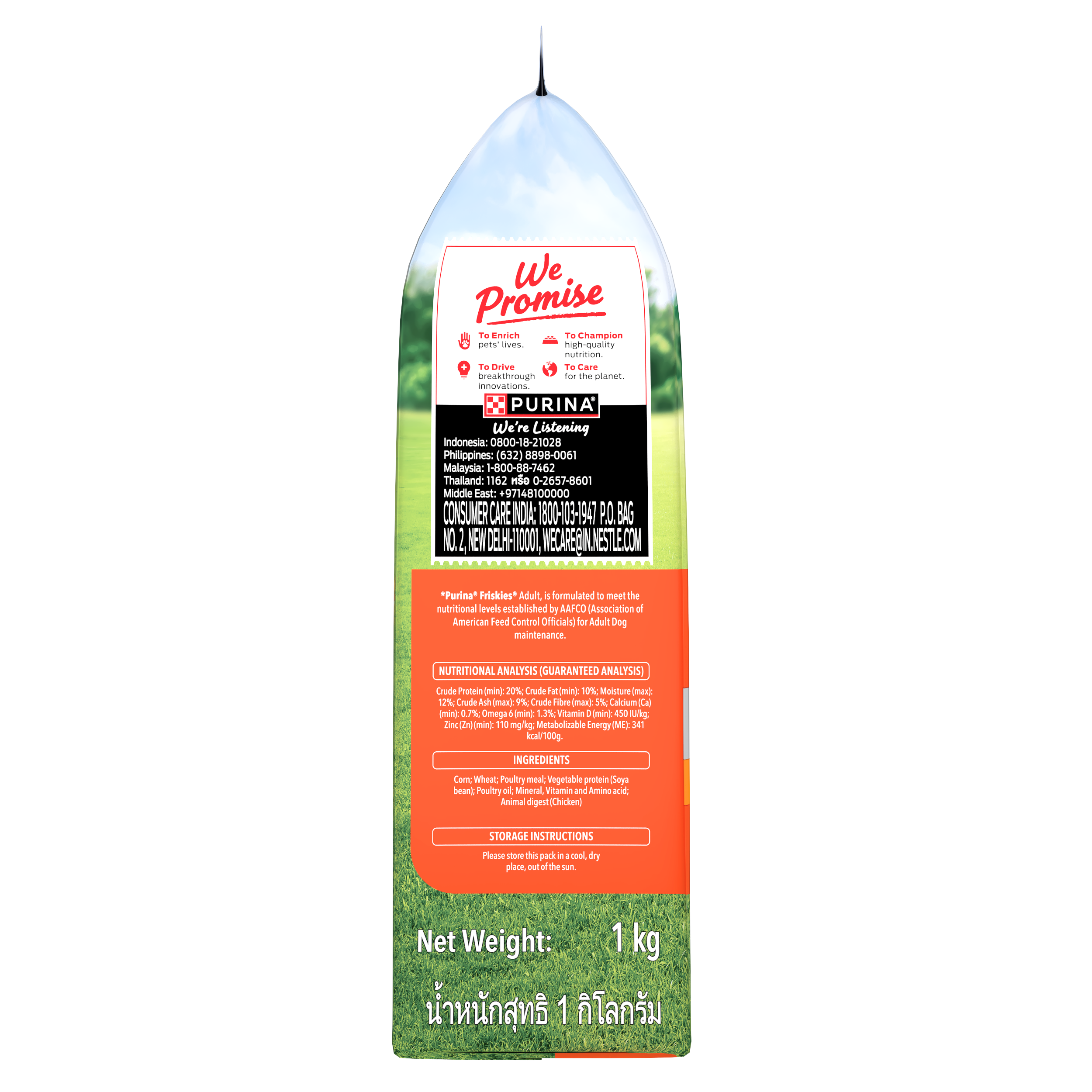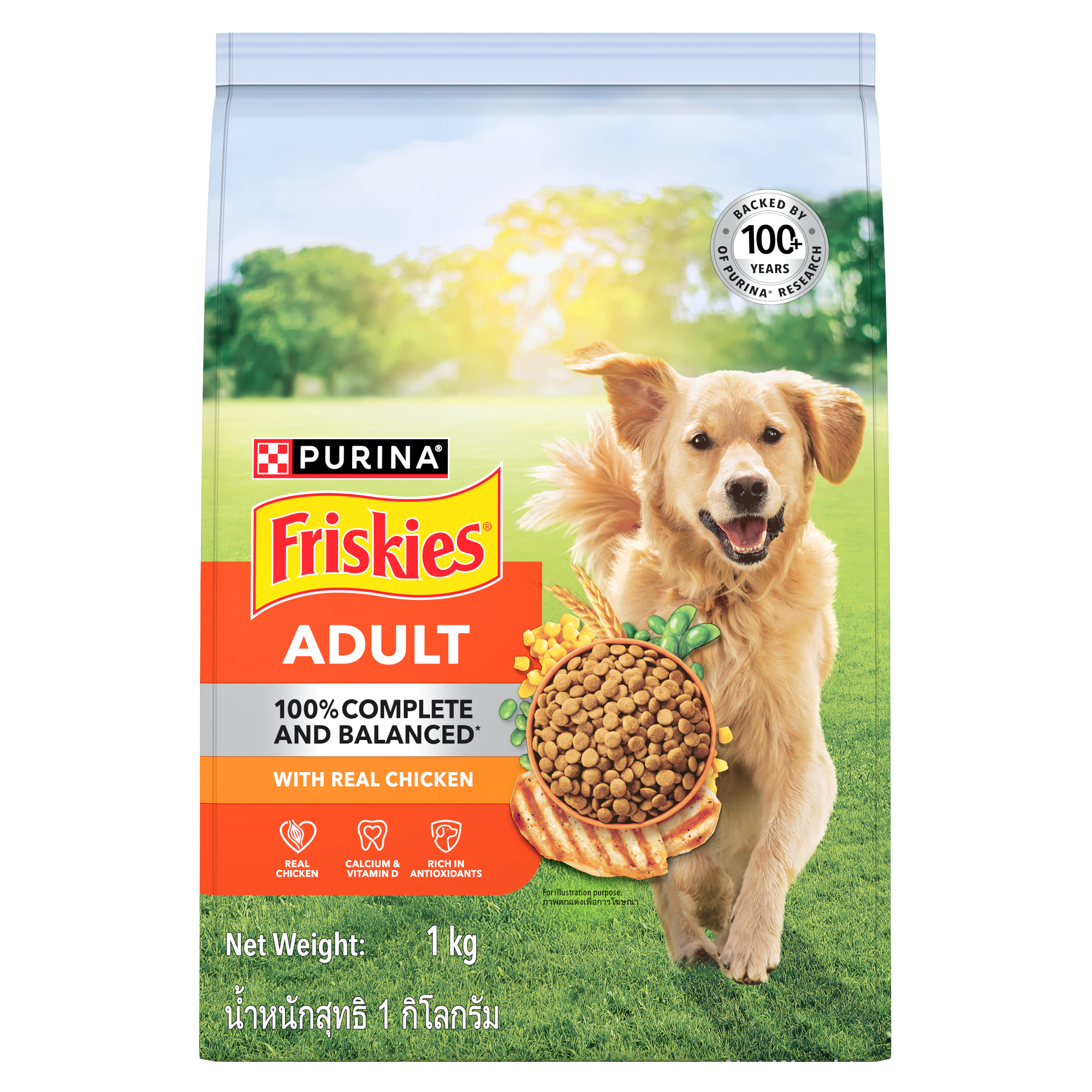 Give your dogs 100% Complete & Balanced Nutrition with Friskies Adult with Real Chicken Flavor. 100% complete and balanced dry dog food specially formulated to support the growth and development of puppies. Made with real chicken as a quality protein source, this recipe provides optimal protein and fat levels to help support healthy growth, strong muscles, and overall development during your puppy’s early life stages. Backed by over 100 years of Purina research, it delivers essential nutrients to support strong bones and teeth, brain development, and natural defences—nourishing puppies from the inside out as they grow.
